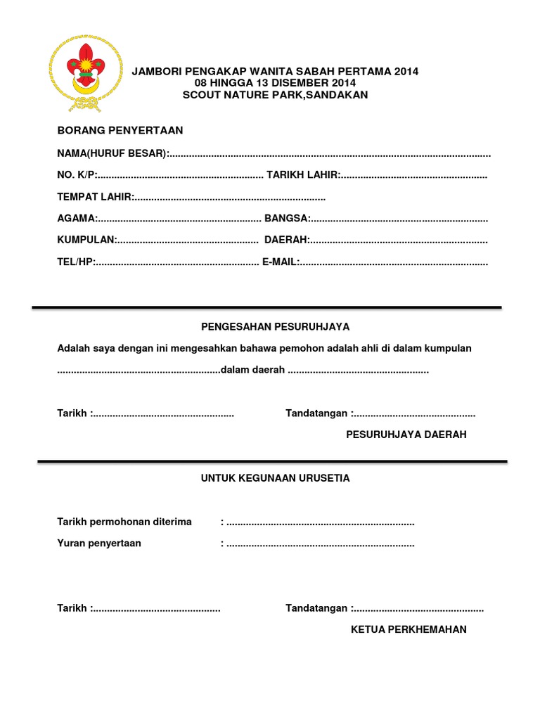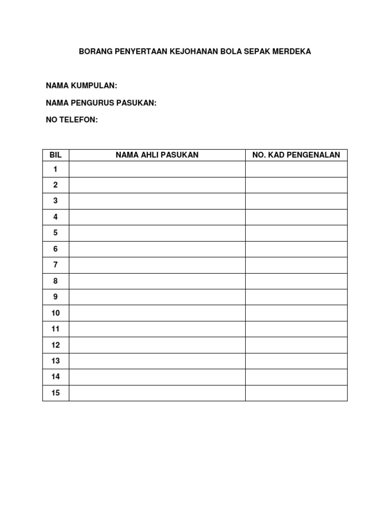 You can use them for any sports from basketball and football to golf and tennis. Take the hassle out of athlete or sporter registration and sponsorships with an online sports form. Borang penyertaan dan Video saringan hendaklah sampai ke pejabat KANITA sebelum 12 mac 2019.